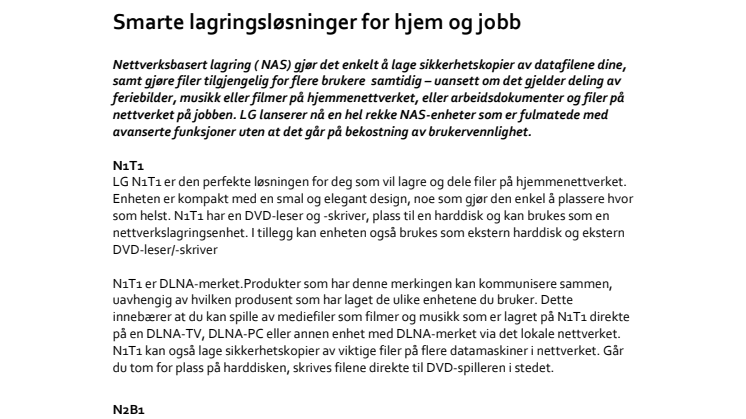 Nettverksbasert lagring ( NAS) gjør det enkelt å lage sikkerhetskopier av datafilene dine, samt gjøre filer tilgjengelig for flere brukere samtidig – uansett om det gjelder deling av feriebilder, musikk eller filmer på hjemmenettverket, eller arbeidsdokumenter og filer på nettverket på jobben. LG lanserer nå en hel rekke NAS-enheter som er fulmatede med avanserte funksjoner uten at det går på bekostning av brukervennlighet.