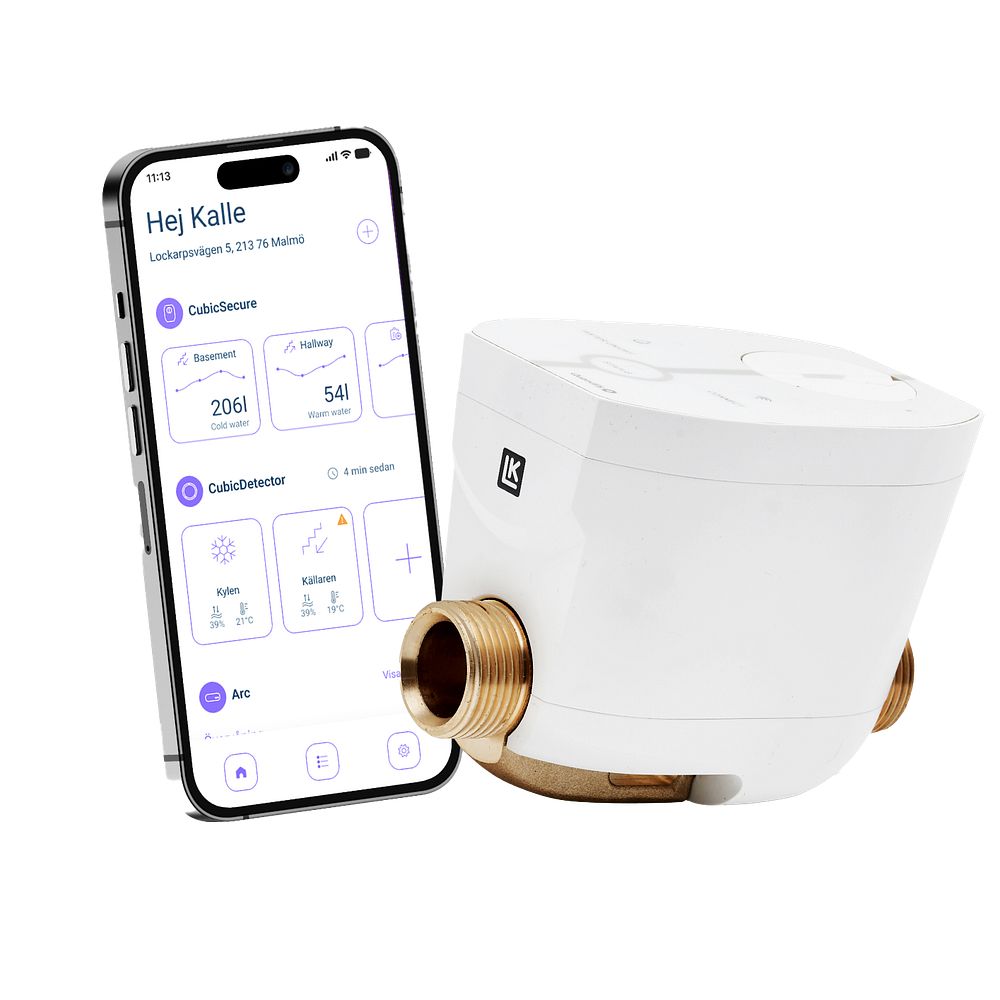 CubicSecure er ikke bare en vannstopper, men en intelligent strømningsmåler som analyserer vannforbruket i sanntid. Den registrerer vannstrømmen, lærer seg husets forbruksmønstre og oppdager unormale avvik, som lekkasjer, dryppende kraner eller rør som står og siver. Oppdages uvanlige mønstre, får du umiddelbart varsel i appen, og CubicSecure kan automatisk stenge vannet for å forhindre skade.