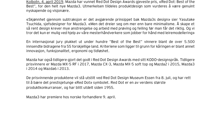 Kolbotn, 4. april 2019. Mazda har vunnet Red Dot Design Awards gjeveste pris, «Red Dot: Best of the Best”, for den helt nye Mazda3. Utmerkelsen tildeles produktdesign som vurderes å være genuint nyskapende og visjonært.