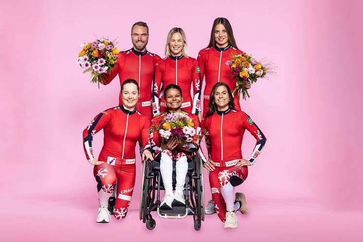 Anne Kjersti Kalvå, Kristine Stavås Skistad og Heidi Weng fra Kvinner Elite og Thomas Karbøl Oxaal, Vilde Nilsen, og Indira Liseth fra Para Elite fronter Rosa sløyfe-aksjonen for Mester Grønn.