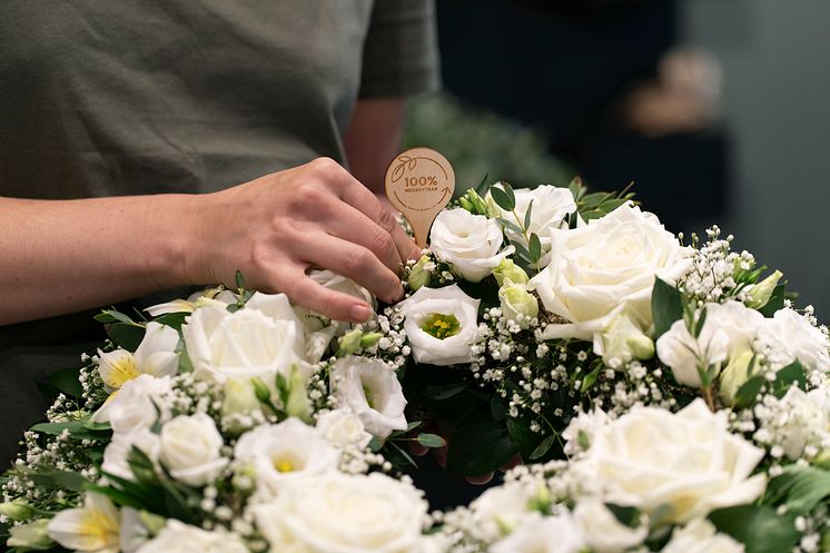Blomstene festes til underlaget med naturtråd. Silkebånd til en siste hilsen er også laget av biologisk nedbrytbart materiale, og båndet festes til produktet med en trepinne. Det vil si at hele produktet kan komposteres.