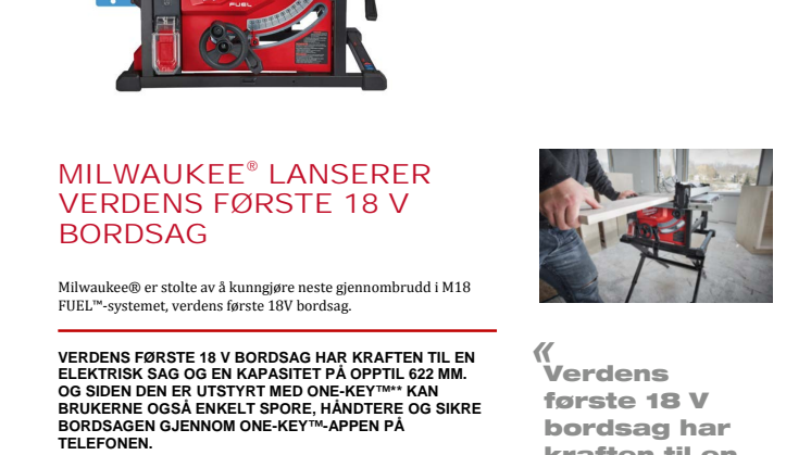 MILWAUKEE® LANSERER VERDENS FØRSTE 18 V BORDSAG