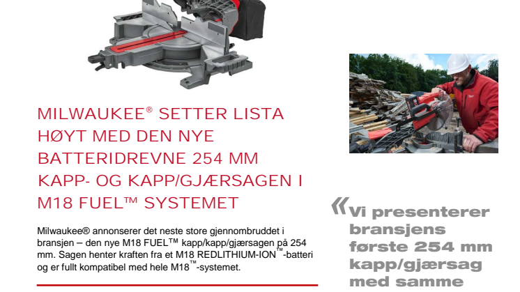 Milwaukee® annonserer det neste store gjennombruddet i bransjen – den nye M18 FUEL™ kapp/kapp/gjærsagen på 254 mm. Sagen henter kraften fra et M18 REDLITHIUM-ION™-batteri og er fullt kompatibel med hele M18™-systemet