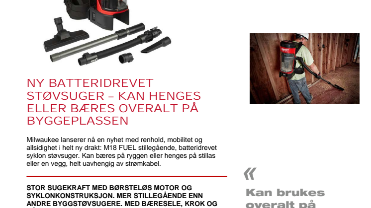 Milwaukee lanserer nå en nyhet med renhold, mobilitet og allsidighet i helt ny drakt: M18 FUEL stillegående, batteridrevet syklon støvsuger. Kan bæres på ryggen eller henges på stillas eller en vegg, helt uavhengig av strømkabel.
