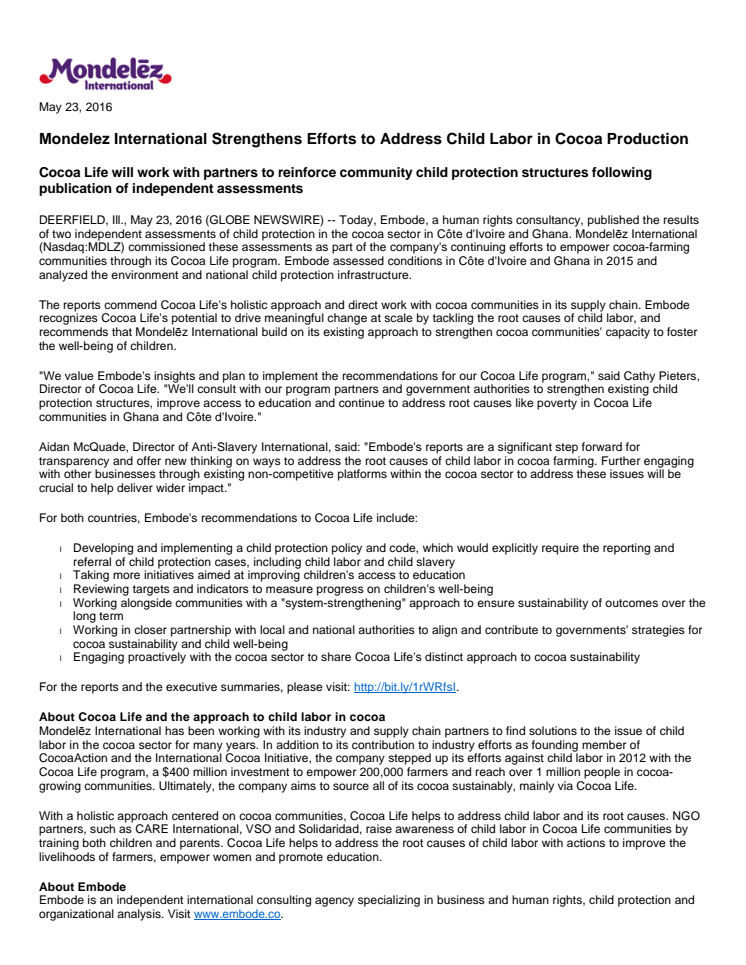 Mondelez International Strengthens Efforts to Address Child Labor in Cocoa Production