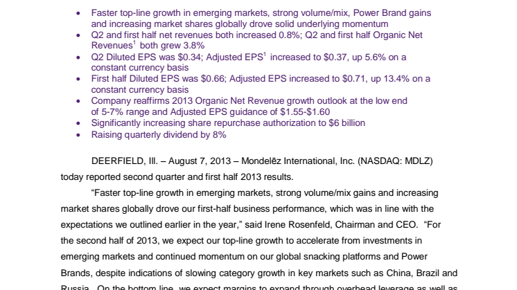 • Mondelēz International Reports Second Quarter and First Half 2013 Results