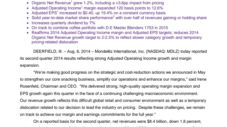 • Mondelēz International Reports Q2 Results; Increases Quarterly Dividend