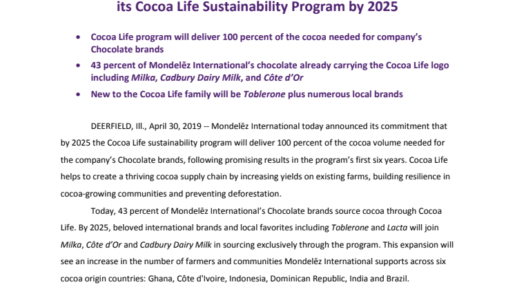 - Cocoa Life program will deliver 100 percent of the cocoa needed for company’s Chocolate brands