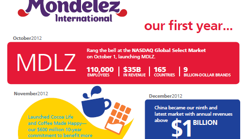 One year ago today, Kraft Foods Inc. became Mondelēz International, Inc. after spinning-off its North American grocery business. Today, Mondelēz International is a global snacking powerhouse uniquely built to deliver sustainable, profitable growth due to its many competitive advantages, including: