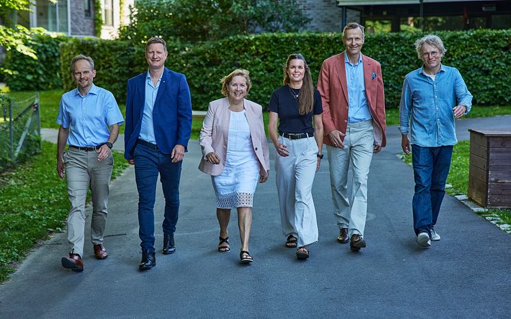 Går sammen for mer ombruk: Fv. konsernsjef Egil Hogna – Norconsult, konsernsjef Amund Tøftum – AF, konsernsjef Grethe Bergly – Multiconsult, bærekraftsjef Stine Marie Thiele Haugen – EBA, konsernleder Nicolai Riise - Mad arkitekter, administrerende direktør Steinar Skjerdingstad i Arkitektbedriftene.