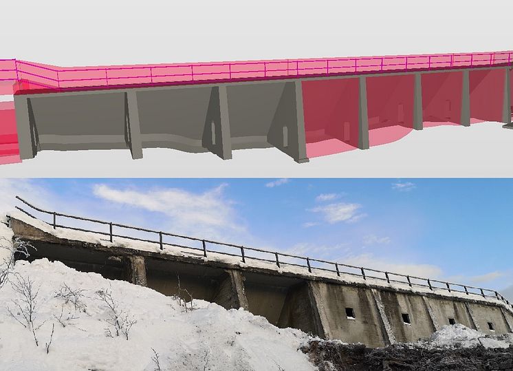 Ny dam Holden_De tre første frostveggene på dam Holden er revet. I rivemodellen illustreres det som skal rives med rød farge Foto Multiconsult