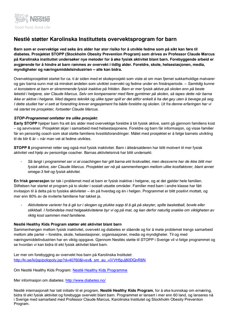 Barn som er overvektige ved seks års alder har stor risiko for å utvikle fedme som på sikt kan føre til diabetes. Prosjektet STOPP (Stockholm Obesity Prevention Program) som drives av Professor Claude Marcus på Karolinska instituttet undersøker nye metoder for å øke fysisk aktivitet blant barn.