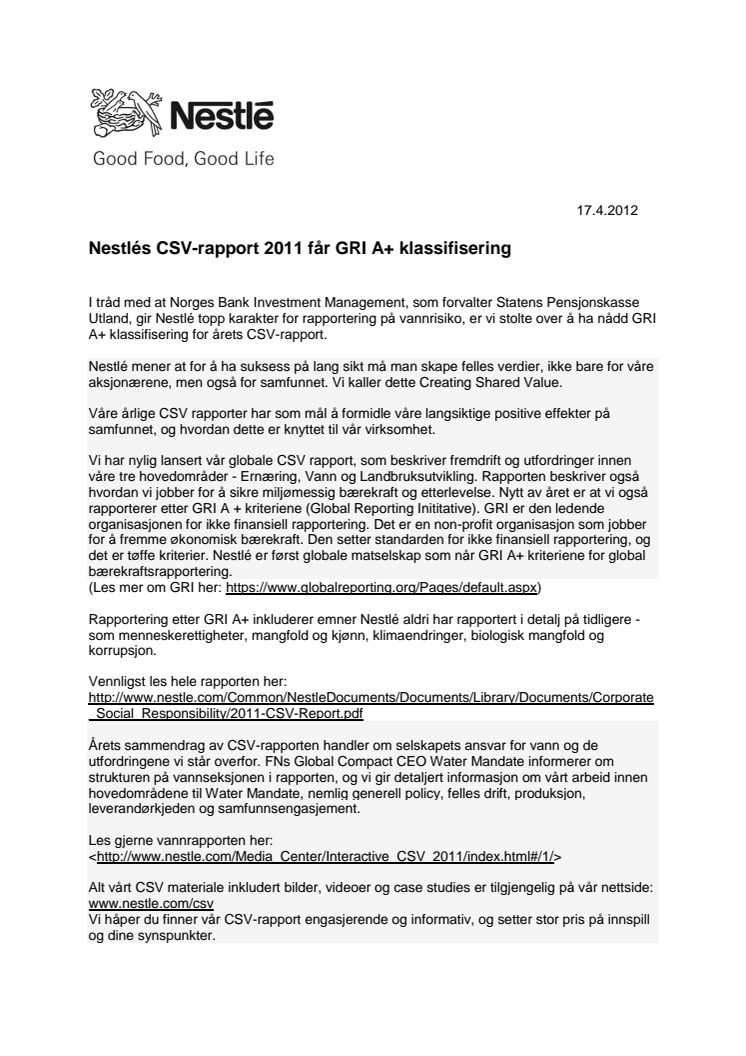 I tråd med at Norges Bank Investment Management, som forvalter Statens Pensjonsfond Utland, gir Nestlé topp karakter for rapportering på vannrisiko, er vi stolte over å ha nådd GRI A+ klassifisering for årets CSV-rapport.