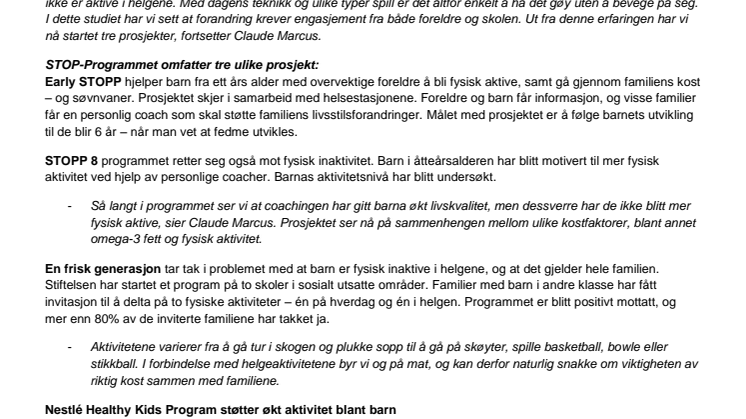 Sammenhengen mellom fysisk inaktivitet, overvekt og diabetes er slående og for å møte problemet trengs samarbeid mellom alle parter – foreldre, skole, helsestasjoner, organisasjoner, media og myndigheter. Til og med næringsmiddelindustrien har en viktig oppgave. Gjennom Nestlés støtte til STOPP i Sverige vil vi følge programmet og se hvordan vi kan bidra til økt fysisk aktivitet blant barn.