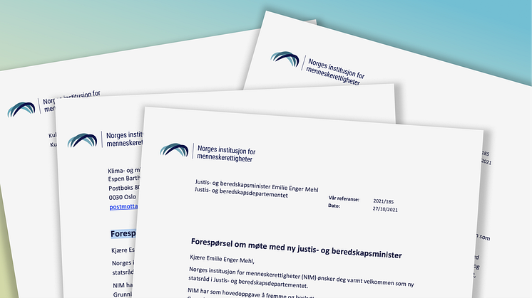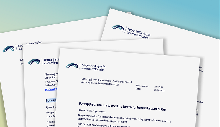 I brevet til klimaministeren påpeker NIM risikoen for at Norges begrensede nasjonale utslippskutt, betydelige eksporterte forbrenningsutslipp og mangel på spesifiserte årlige planer frem til nullutslipp er i strid med grunnleggende rettigheter. For å styrke den menneskerettslige etterlevelsen på klimaområdet, anbefaler NIM den nye klima- og miljøministeren å revidere klimaloven for å lovfeste 1,5-gradersmålet, spesifisere årlige kutt frem til nullutslipp og opprette en uavhengig klimakommisjon.