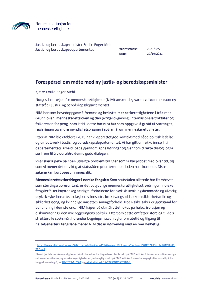 Temaet for brevet til justis- og beredskapsministeren er en rekke forhold NIM håper statsråden vil prioritere i videre arbeid, slik som forholdene for innsatte i norske fengsler, ivaretakelse av barns rettigheter, erstatning for ikke-økonomisk tap ved krenkelser av menneskerettighetene, og endring av vergemålssystemet i tråd med FNs konvensjon om rettighetene til mennesker med funksjonsnedsettelser (CRPD)
