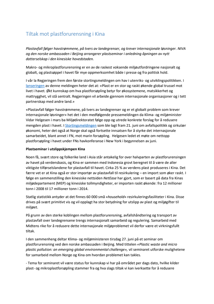 Plastavfall følger havstrømmene, på tvers av landegrenser. Klima- og miljøminister Vidar Helgesen deltar 27. juni på et seminar om plastforurensning ved den norske ambassaden i Beijing. Seminaret utforsker mulighetene for samarbeid mellom Norge og Kina om hvordan plastproblemet kan takles. Samme dag åpner NIVA nytt datterselskap i den kinesiske hovedstaden.