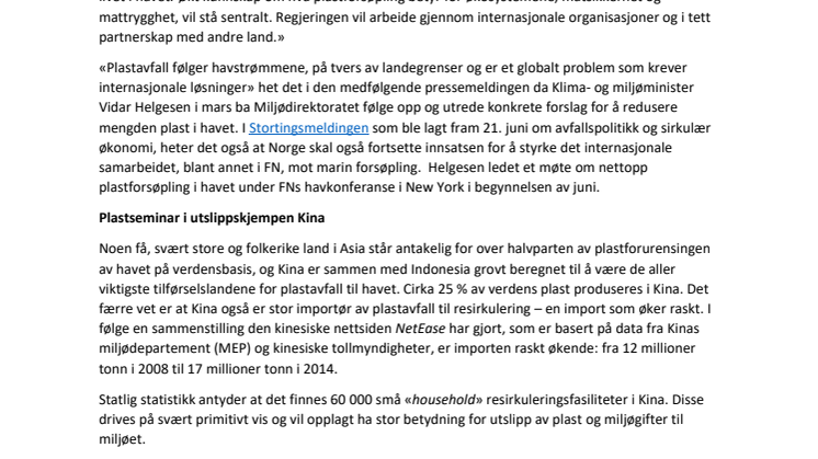 I den sammenheng deltar Klima- og miljøministeren tirsdag 27. juni på et seminar om plastforurensning ved den norske ambassaden i Beijing. Med tittelen «Plastic waste and micro plastic pollution: an emerging global environmental challenge», vil seminaret utforske mulighetene for samarbeid mellom Norge og Kina om hvordan problemet kan takles.
