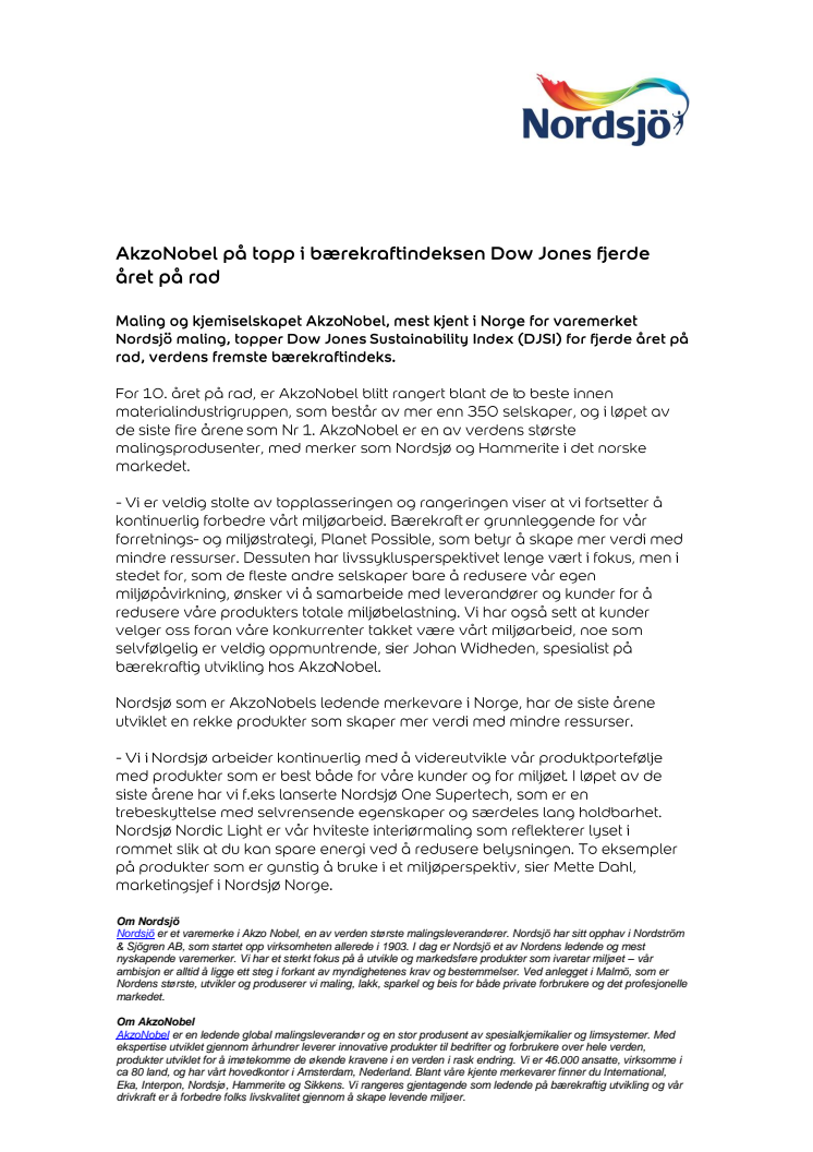 Maling og kjemiselskapet AkzoNobel, mest kjent i Norge for varemerket Nordsjö maling, topper Dow Jones Sustainability Index (DJSI) for fjerde året på rad, verdens fremste bærekraftindeks.