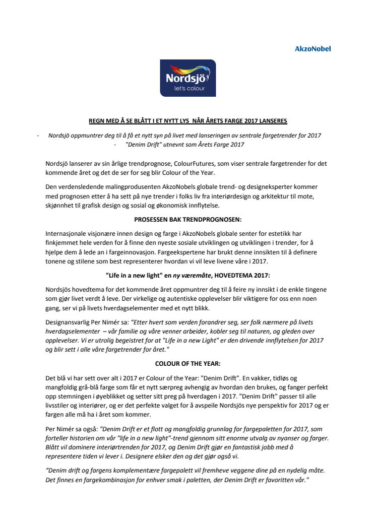 Colour of the Year 2017 "Denim Drift" - en vakker, tidløs og mangfoldig grå-blå farge som får et nytt særpreg avhengig av hvordan den brukes, og fanger perfekt opp stemningen i øyeblikket og setter sitt preg på hverdagen i 2017. "Denim Drift" passer til alle livsstiler og interiører.