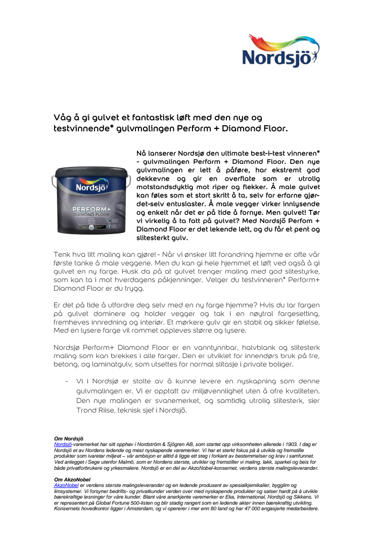 Nå lanserer Nordsjø den ultimate best-i-test vinneren* - gulvmalingen Perform+ Diamond Floor. Den nye gulvmalingen er lett å påføre, har ekstremt god dekkevne og gir en overflate som er utrolig motstandsdyktig mot riper og flekker.