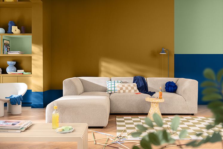 Nordsjö Årets farge 2026, den intense Free Groove™, bringer livlighet inn i hjemmet. Her i en dynamisk kombinasjon med Brave Olive på den øvre delen av veggen, fint balansert med Bamboo Twist som den dominerende veggfargen.