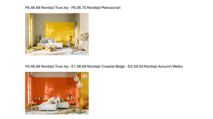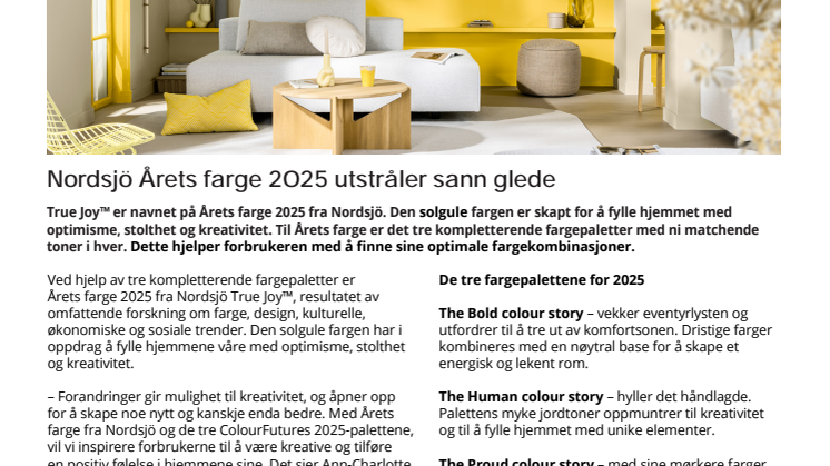 Ved hjelp av tre kompletterende fargepaletter er Årets farge 2025 fra Nordsjö True Joy™, resultatet av omfattende forskning om farge, design, kulturelle, økonomiske og sosiale trender. Den solgule fargen har i oppdrag å fylle hjemmene våre med optimisme, stolthet og kreativitet.