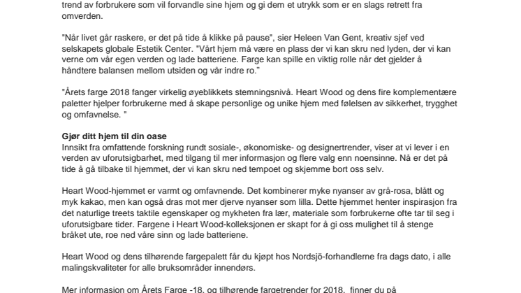 "Årets farge 2018 fanger virkelig øyeblikkets stemningsnivå. Heart Wood og dens fire komplementære paletter hjelper forbrukerne med å skape personlige og unike hjem med følelsen av sikkerhet, trygghet og omfavnelse."
