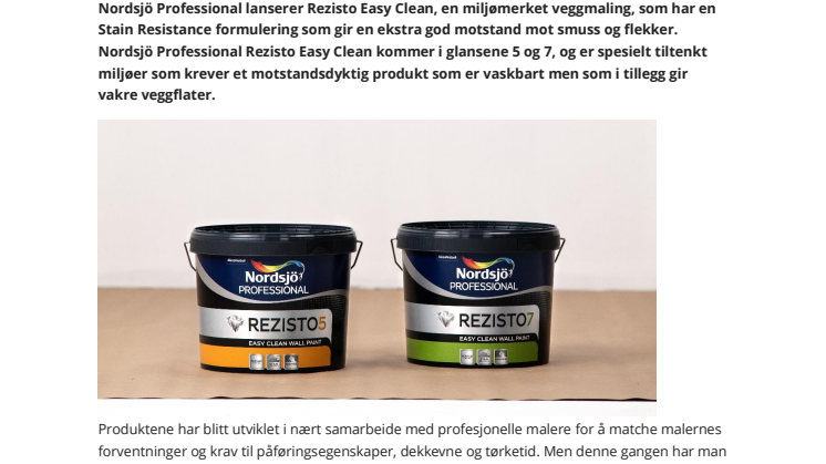 Nordsjö Professional lanserer Rezisto Easy Clean, en miljømerket veggmaling, som har en Stain Resistance formulering som gir en ekstra god motstand mot smuss og flekker. Nordsjö Professional Rezisto Easy Clean kommer i glansene 5 og 7, og er spesielt tiltenkt miljøer som krever et motstandsdyktig produkt som er vaskbart men som i tillegg gir vakre veggflater.