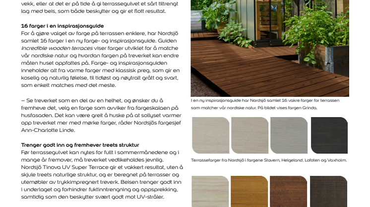 For å gjøre valget av farge på terrassen enklere, har Nordsjö samlet 16 farger i en ny farge- og inspirasjonsguide. Guiden Incredible wooden terraces viser farger utviklet for å matche vår nordiske natur og hvordan fargen på treverket kan endre måten huset oppfattes på. Farge- og inspirasjonsguiden inneholder alt fra varme farger med klassisk preg, som gir en koselig og naturlig følelse, til tidløst og nøytralt grått og svart, som enkelt matches med det meste.