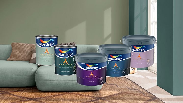 Med Nordsjös premiumkolleksjon, Ambiance interiørmaling, står estetikk og kvalitet i sentrum og oppmuntrer deg til å sette ditt personlige preg på interiøret. Nordsjö Ambiance, som består av innendørs maling for vegger, tak, dører og lister, presenteres nå med produkter i forbedrede kvaliteter og et nytt stilrent design! Samtidig lanseres helt nye fargepaletter fordelt på fire ulike temaer, fra moderne samtid til luksuriøs klassisk.