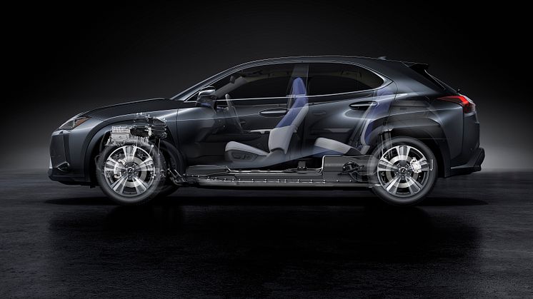 - UX 300e har ypperlige dynamiske egenskaper takket være bilens lave tyngdepunkt. Det lave tyngdepunktet er et resultat av optimal vektfordeling, og at motoren og batteriet er plassert under bilen.
