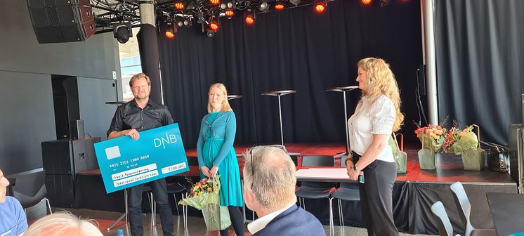 Pål Grødahl, politisk rådgiver og Ida Habbestad, daglig leder i Norsk Komponistforening mottar gavesjekk av Marit Kaupang Klewe i Sparebanken DNB