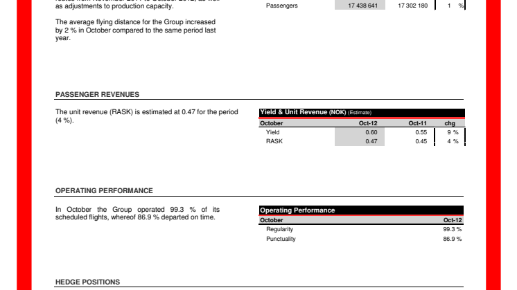 I oktober i år fløy 1 646 938 passasjerer med Norwegian. Den totale trafikkveksten (RPK) økte med 11 prosent, mens kapasiteten økte med 15 prosent. På inntektssiden er også tallene positive, med en økning i enhetsinntekten (RASK) på 4 prosent. Fyllingsgraden var 78 prosent i oktober.