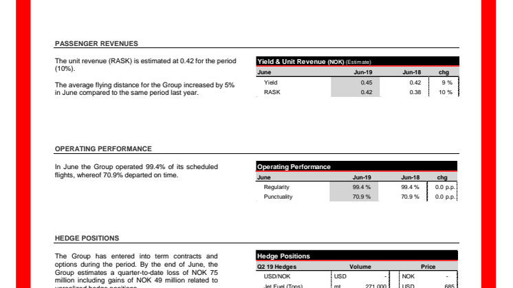 Norwegian gjennomførte 99,4 prosent av de planlagte flygningene i juni. Punktligheten var på 70,9 prosent (uendret fra samme tid i 2018). Punktligheten denne måneden påvirkes negativt av at selskapet har 18 Boeing 737 MAX på bakken og dermed benytter mer innleiefly enn normalt.