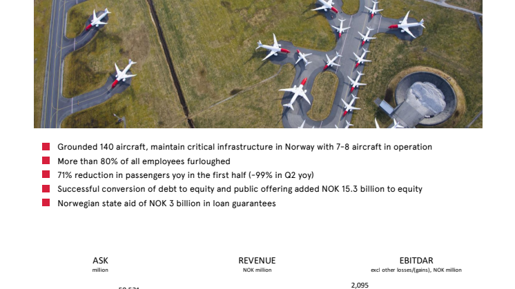 Norwegian legger fredag frem tallene for første halvår 2020 og andre kvartal. Tallene er som ventet kraftig påvirket av Covid-19-pandemien, med et nettotap på 5,3 milliarder kroner. I første halvår 2020 reiste 5,31 millioner kunder med selskapet; en nedgang på 71 prosent sammenlignet med samme periode i fjor. Norwegian lyktes med å omgjøre gjeld og gjennomførte en rettet emisjon, samt redusert kostnader gjennom en rekke tiltak. Likevel er situasjonen for Norwegian svært utfordrende fremover.