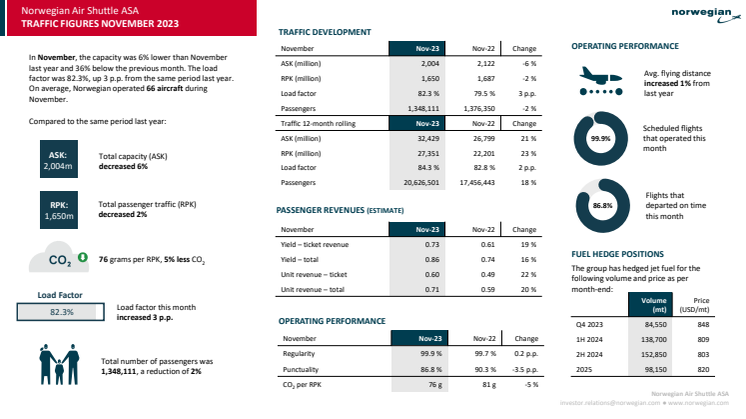 Norwegian hadde 1 348 111 passasjerer i november, to prosent færre enn i samme måned i fjor. Det må ses i lys av en betydelig reduksjon i kapasiteten i lavsesong. Kapasiteten (ASK) var 2 004 millioner setekilometer, mens faktisk passasjertrafikk (RPK) var 1 650 millioner setekilometer. I november hadde Norwegian i gjennomsnitt 66 fly i drift, og 99,9 prosent av oppsatte flyvninger ble gjennomført. Punktligheten, målt som andel avganger innen 15 minutter etter ordinær tid, var med 86,8 prosent fortsatt høy i november.