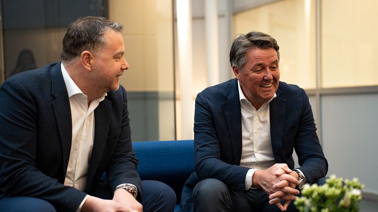 Lars Bjørn Larsen, kommersiell direktør i Norsk e-Fuel og Geir Karlsen, konsernsjef i Norwegian, møter hverandre til signering på Norwegians hovedkontor på Fornebu.