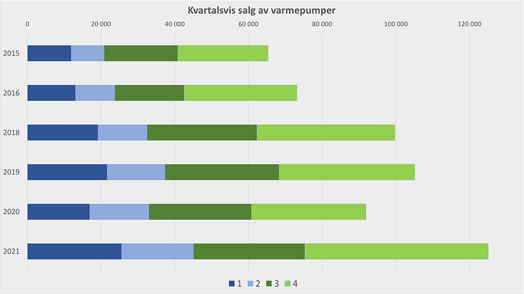 Totalt ble det solgt 125 000 varmepumper i fjor. Etterspørselen etter luft-til-varmepumper var veldig bra hele året, men fra oktober fikk alle varmepumpetypene et skikkelig løft. – Fjerde kvartal slår alt annet vi har sett, med nesten 50 000 enheter, fastslår daglig leder Rolf Iver Mytting Hagemo