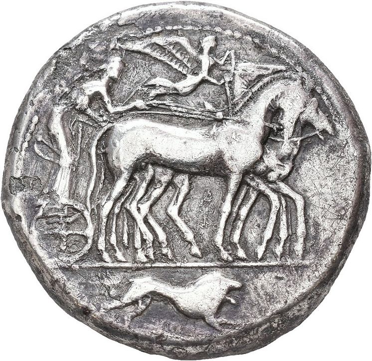 Syrakus-myntens forside er preget med en stridsvogn, seiersgudinnen Nike og løve.