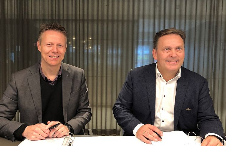 På bildet: Richard Groven (eiendomssjef i Oslo Pensjonsforsikring) og Tor Rønhovde (administrende direktør i 4Services)
