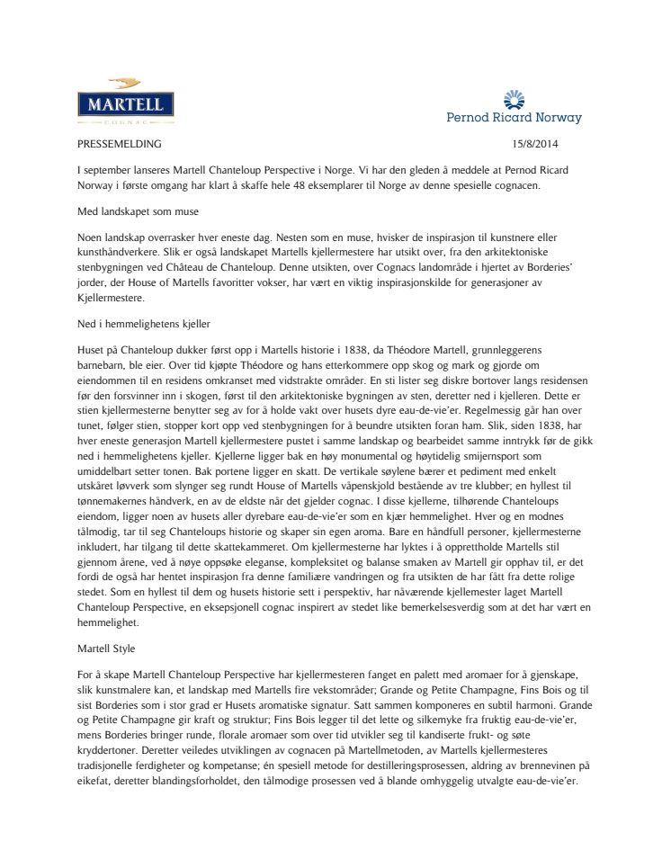 I september lanseres Martell Chanteloup Perspective i Norge. Vi har den gleden å meddele at Pernod Ricard Norway i første omgang har klart å skaffe hele 48 eksemplarer til Norge av denne spesielle cognacen.