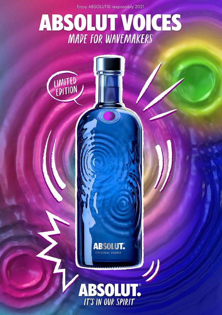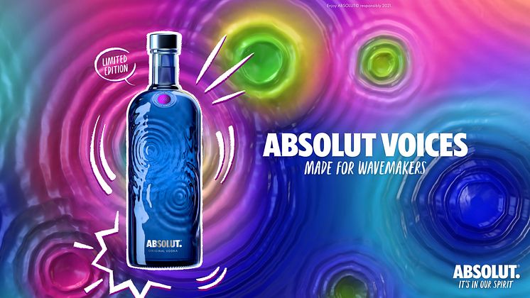 Absolut Voices skaper bokstavelig talt bølger med et unikt flaskedesign som illustrerer ekspanderende lydbølger. I tillegg er den blå flasken laget av 80 prosent resirkulert glass. Dette er den høyeste andelen av gjenbrukt glass til dags dato!
