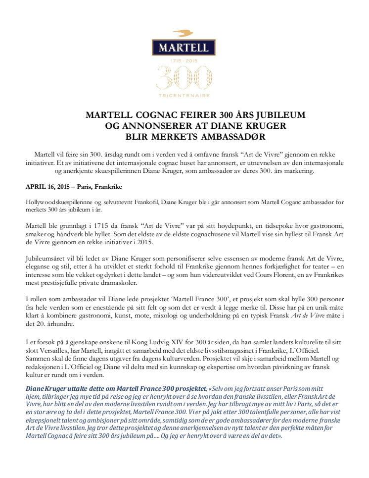 Diane Kruger uttalte dette om Martell France 300 prosjektet; «Selv om jeg fortsatt anser Paris som mitt hjem, tilbringer jeg mye tid på reise og jeg er henrykt over å se hvordan den franske livsstilen, eller Fransk Art de Vivre, har blitt en del av den moderne livsstilen rundt om i verden. Jeg har tilbragt mye av mitt liv i Paris, så det er en stor ære og ta del i dette prosjektet, Martell France 300. Vi er på jakt etter 300 talentfulle personer, alle har vist eksepsjonelt talent og ambisjoner på sitt område, samtidig som de er gode ambassadører for den moderne franske Art de Vivre livsstilen. Jeg tror dette prosjektet og denne anerkjennelsen av nytt talent er den perfekte måten for Martell Cognac å feire sitt 300 års jubileum på…. Og jeg er henrykt over å være en del av det».