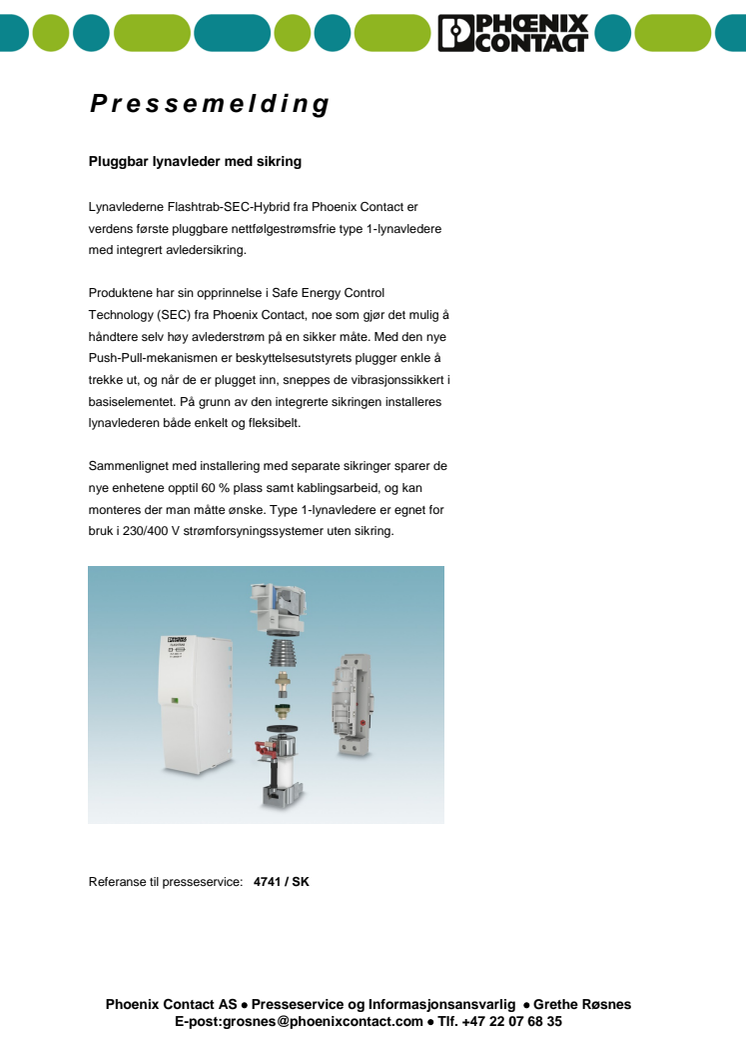 Lynavlederne Flashtrab-SEC-Hybrid fra Phoenix Contact er verdens første pluggbare nettfølgestrømsfrie type 1-lynavledere med integrert avledersikring.