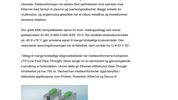 Medieomformervarianten med singlemodus-glassfiber dekker avstander opptil 40 kilometer. Dataoverføringen via optiske fibre optimaliserer bruk sammen med Ethernet med hensyn til yteevne og overføringssikkerhet. Begge enheter for multimodus- og singlemodus-glassfiber har et robust metallhus og imøtekommer ekstreme miljøkrav.