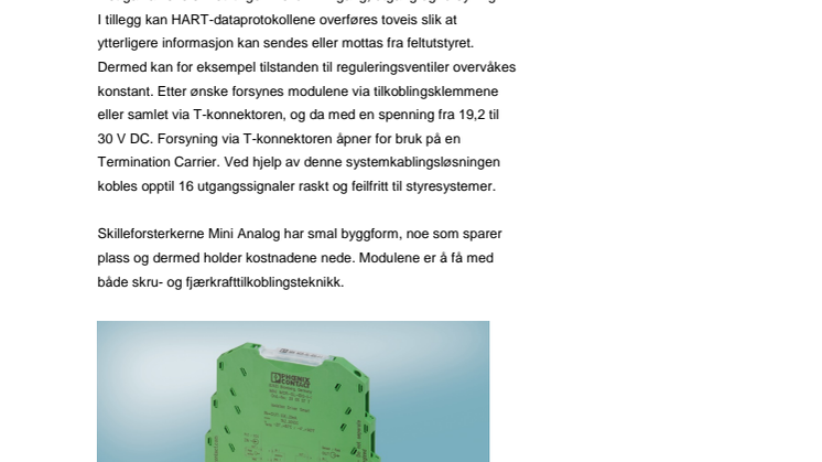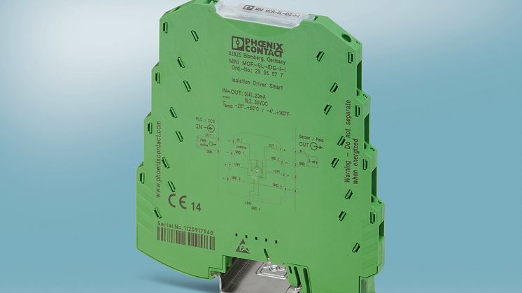 Den nye 6,2 mm smale utgangsskilleforsterkeren Mini MCR-SL-IDS-I-I i produktserien Mini Analog overfører 0/4-20 mA-signaler galvanisk adskilt fra styringen til en last i felten som for eksempel