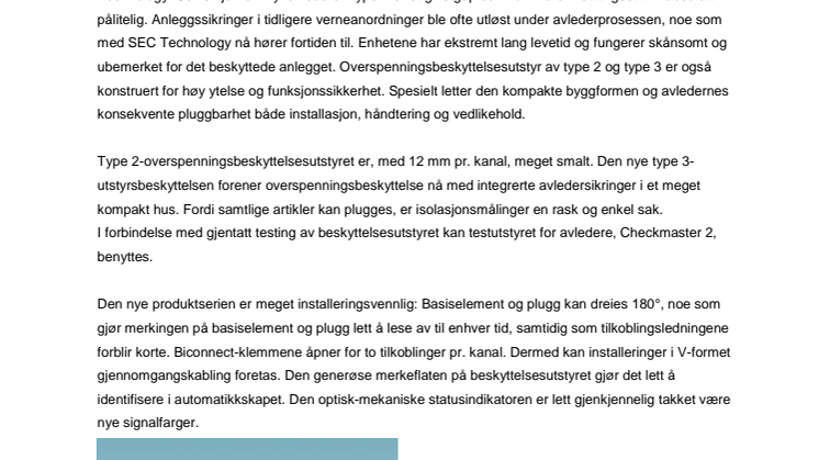 Type 2-overspenningsbeskyttelsesutstyret er, med 12 mm pr. kanal, meget smalt. Den nye type 3-utstyrsbeskyttelsen forener overspenningsbeskyttelse nå med integrerte avledersikringer i et meget kompakt hus. Fordi samtlige artikler kan plugges, er isolasjonsmålinger en rask og enkel sak. I forbindelse med gjentatt testing av beskyttelsesutstyret kan testutstyret for avledere, Checkmaster 2, benyttes.