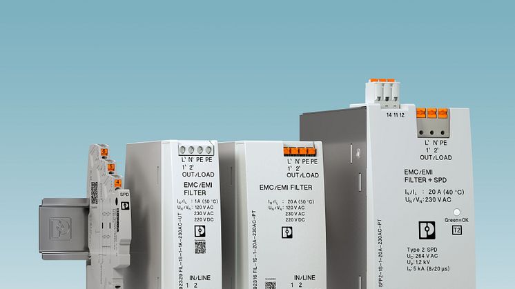 Produktvariantene SFP2 gir effektiv beskyttelse mot transient overspenning og HF-forstyrrelser. Denne integrerte overspenningsbeskyttelsen beskytter mot overspenning på både inn- og utgangssiden av filteret. Filtre i produktseriene FIL har ytterligere PE-tilkoblingspunkter. Dermed forbedres filtereffekten ved høyfrekvente feil mellom de aktive lederne og jordpotensialet. Slik oppnår man optimalisert EMC-installering og forbedret beskyttende effekt også ved EMC-filtre i kunststoffhus. De nye EMC-filtrene finnes med push-in- og skrutilkoblingsteknikk.