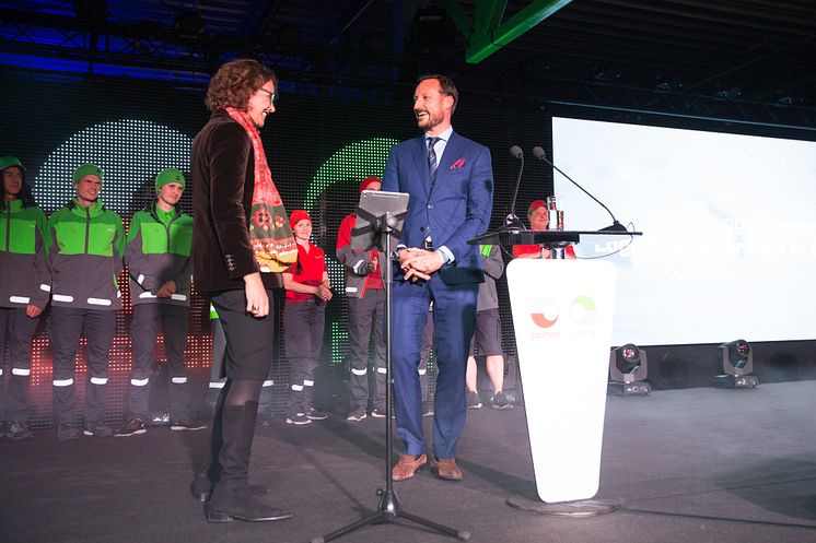 HKH kronprins Haakon åpnet Logistikksenter Oslo, her på scenen med konsernsjef Tone Wille.